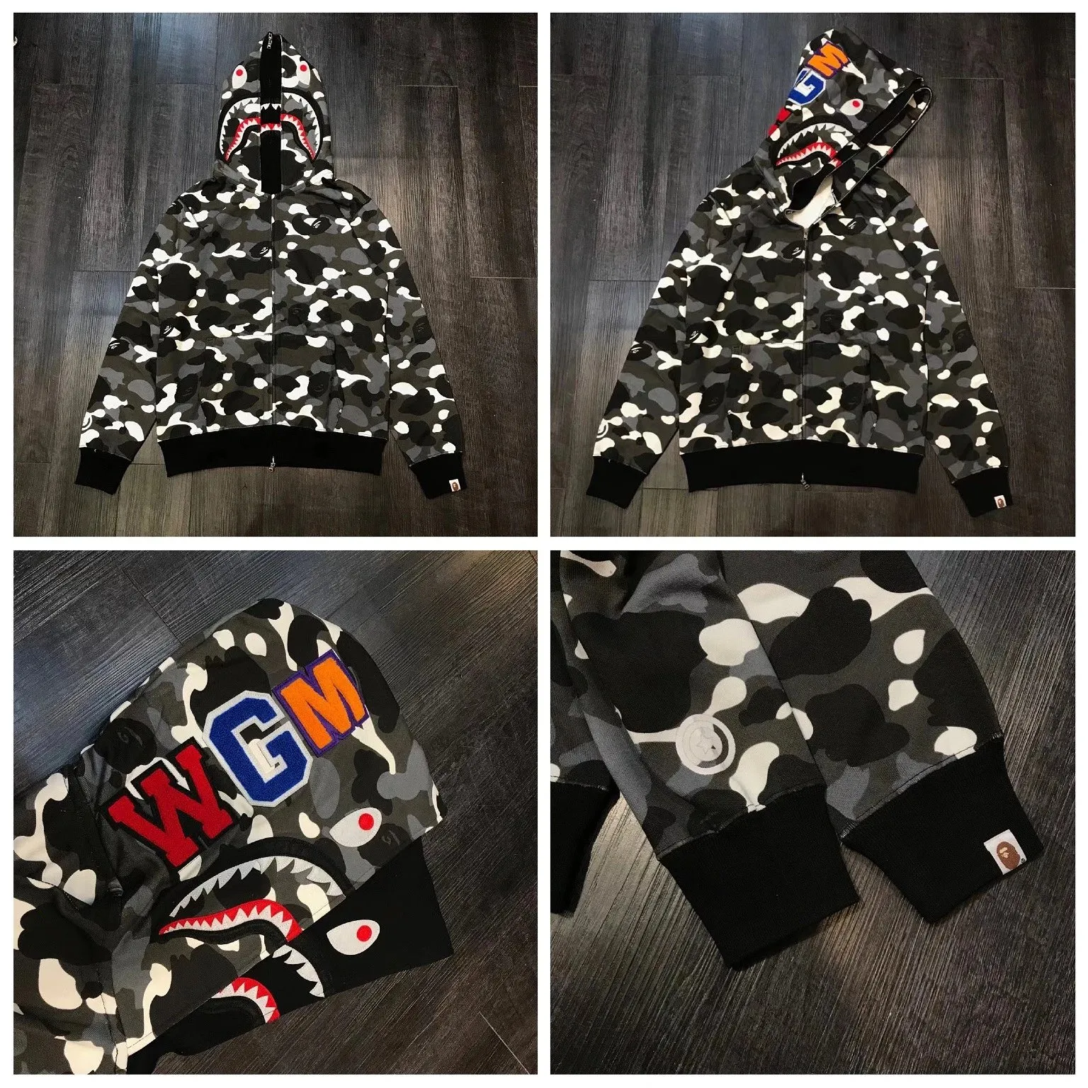 Bape Shark Hoodie Black White Camo Men’s in the Litbuy spreadsheet.This Bape Shark Hoodie is a must – have for streetwear enthusiasts. The iconic shark mouth design on the hood is super eye – catching. The black and white camouflage pattern gives it a tough and edgy look. Made with quality materials, it’s comfortable for daily wear. Whether you’re hitting the streets or hanging out with friends, this hoodie will make you stand out. It combines style and comfort perfectly, and the bold “WGM” embroidery on the back adds a touch of uniqueness.