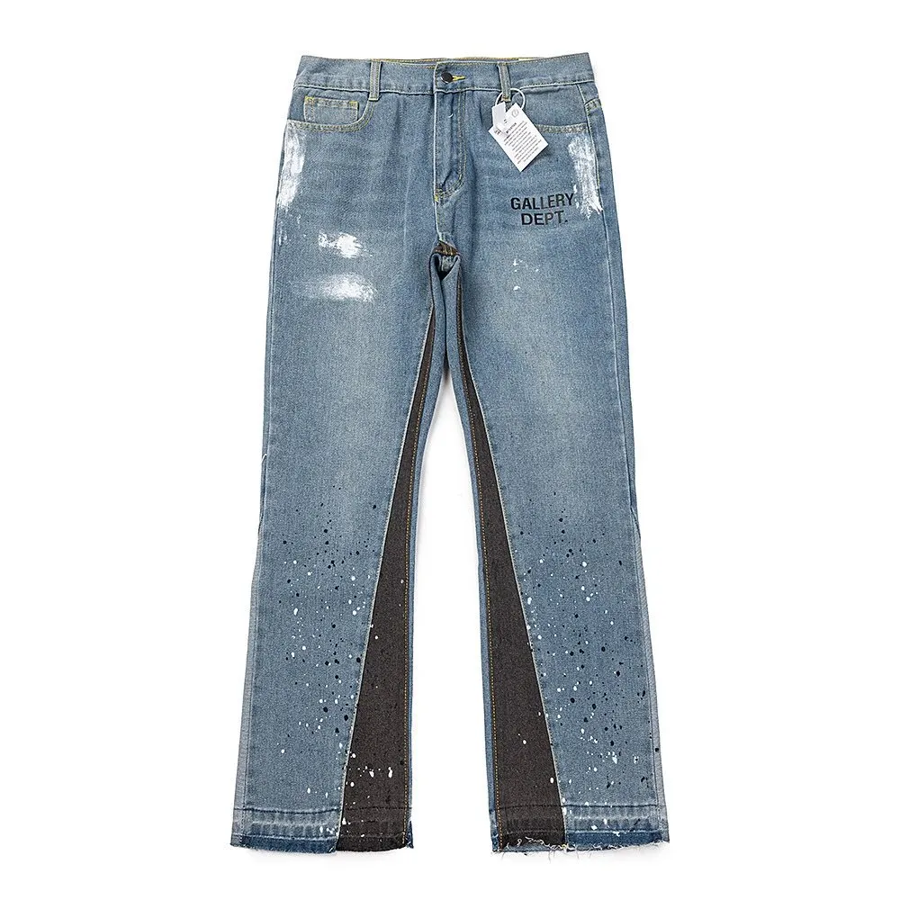GALLERY DEPT. Light Blue Edgy Denim in the Litbuy spreadsheet.These GALLERY DEPT. jeans are a statement piece. The light – blue denim is given a unique touch with black and white paint splatters, creating an urban, artistic look. The contrasting black panels on the lower legs add an edgy vibe. Made with quality denim, they offer both style and comfort. Perfect for those who want to stand out in the crowd and express their individuality through fashion. Whether paired with a simple tee or a more elaborate top, these jeans are sure to turn heads.