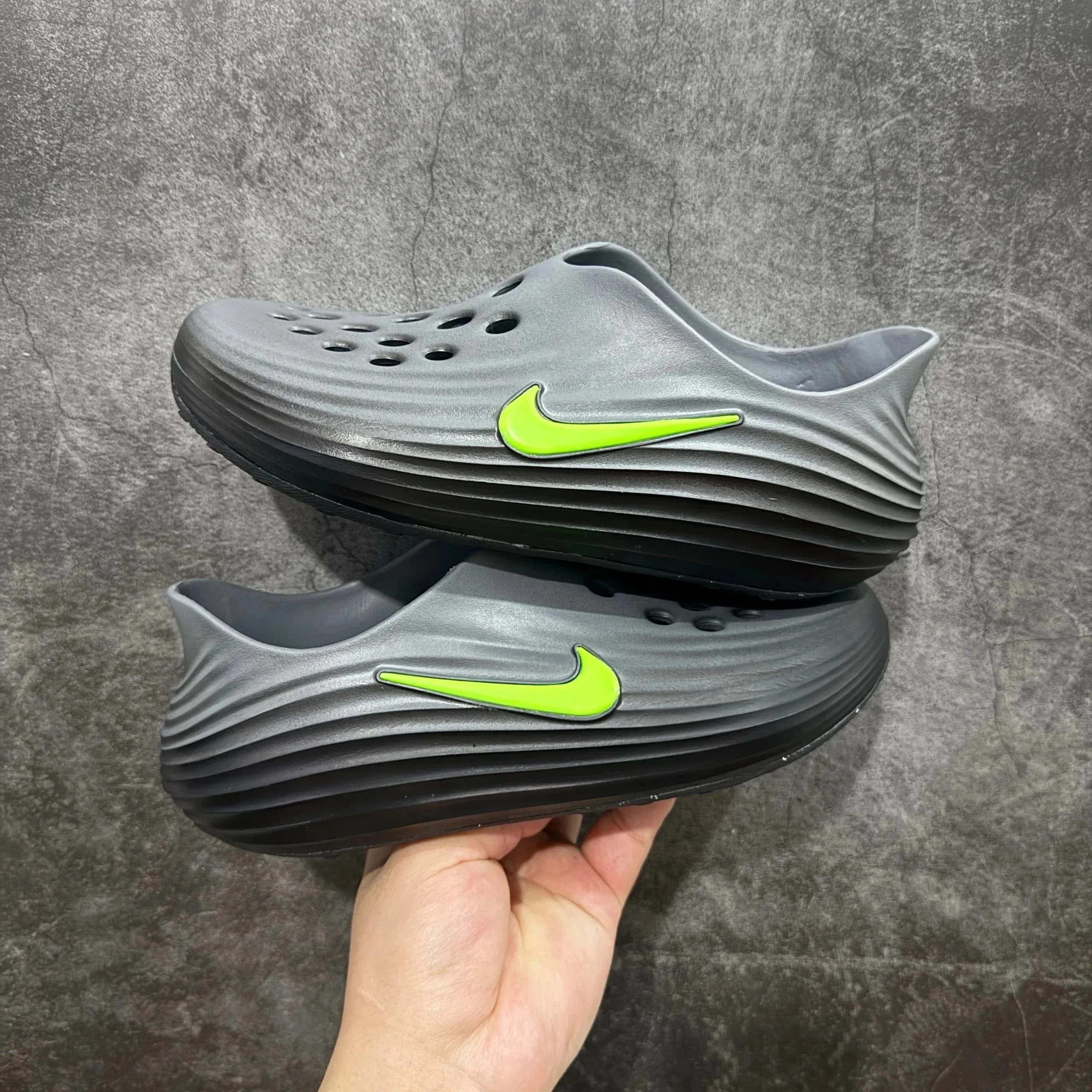 Nike Wave sole Grey and Neon Green Casual in the Litbuy spreadsheet.Check out these awesome Nike slip – on shoes! They feature a cool wave – like sole design that not only looks unique but also provides great support. The grey base color is complemented by a vibrant neon green Nike logo, adding a pop of color. With holes for breathability, these shoes are perfect for casual days, whether you’re running errands or hanging out with friends. They’re comfortable, stylish, and sure to turn heads!